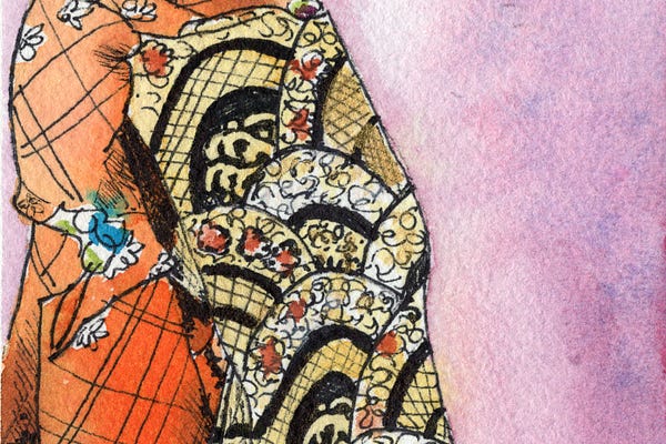 If you look at the painting attached to this post, you will see the back of a maiko. I painted this from a photograph that I took during the Gion…